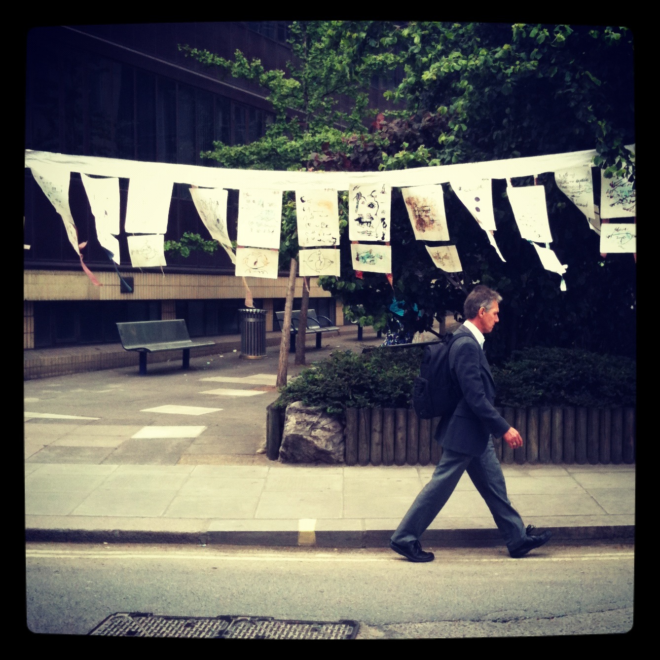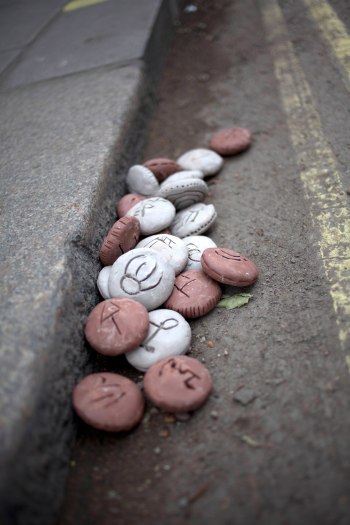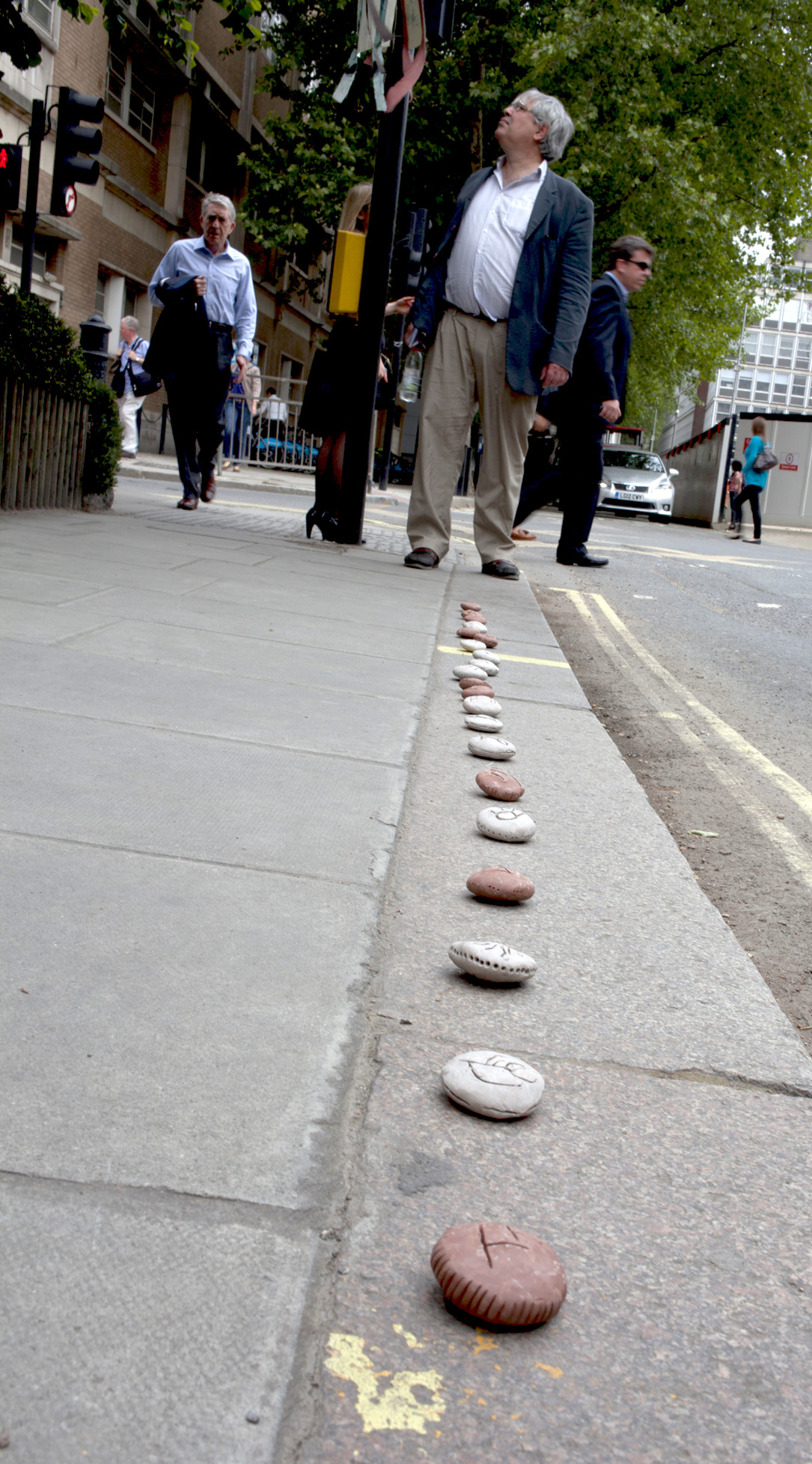 – Wanting the exhibition, like the process, to be tactile (for, despite the digital age, we are physical creatures and understand, and feel connected to the world around us accordingly) I created clay ‘stones’ and inscribed symbols from the letters onto them so that, though the letters were out of reach the symbols could be studied by both eyes and fingers. These stones were placed in the street. Embedded in life outside of galleries.