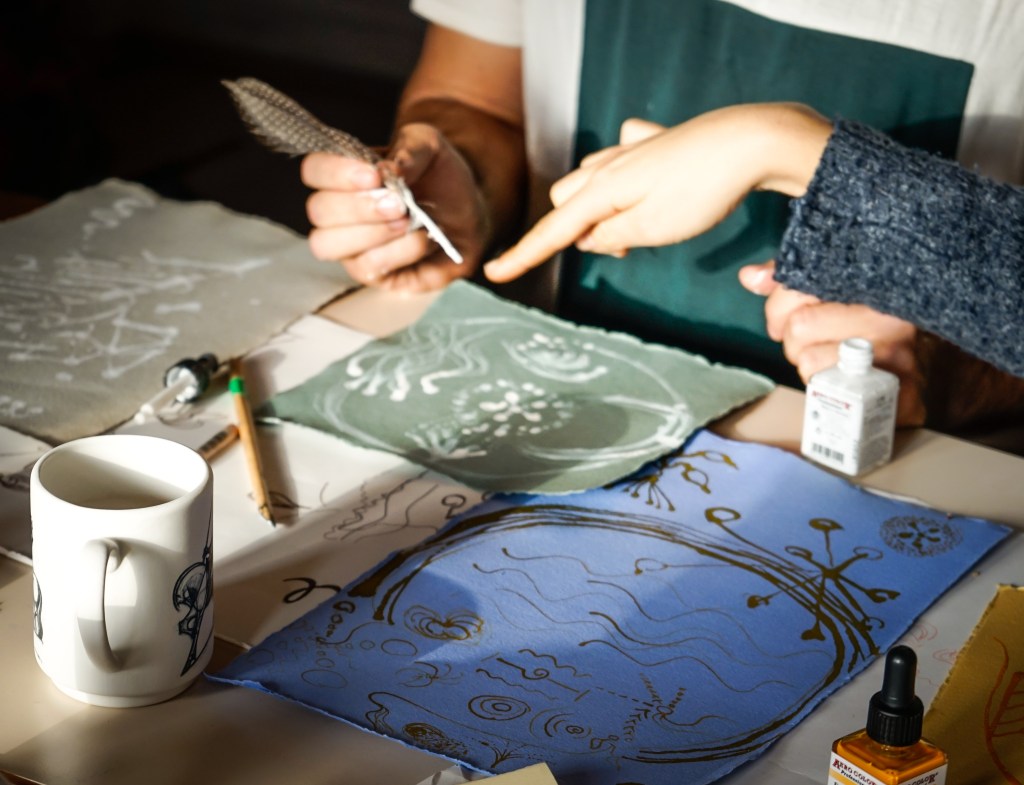 * We will work with visual tools, ink and paper, but there is no need for experience with making artwork as we will develop our own visual language during the workshop. It’s about play and discovery, finding your own relationship with these tools. Using exploration not explanation to explore your own story.